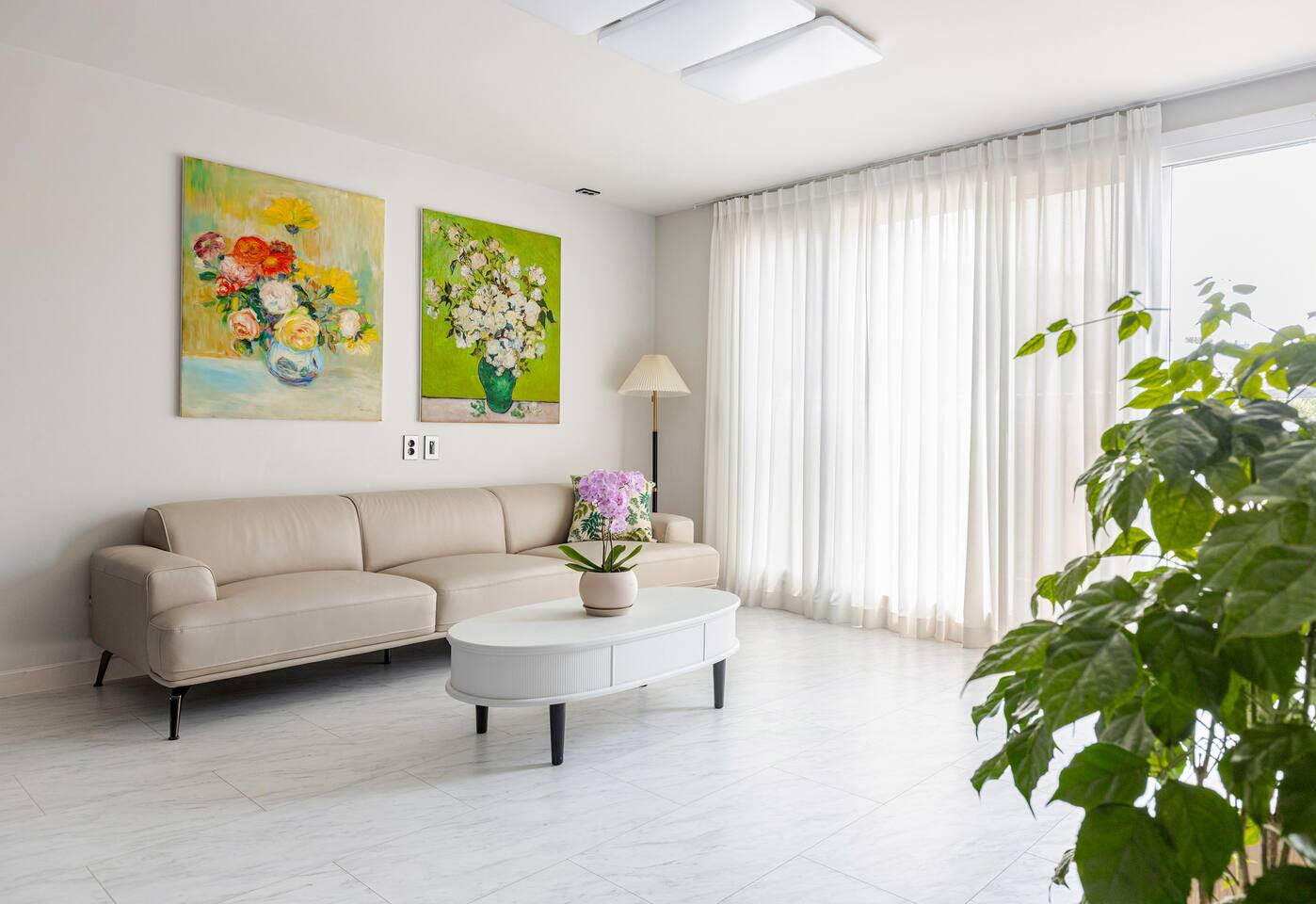 Living Room: A leather sofa and a 75-inch TV for your entertainment.